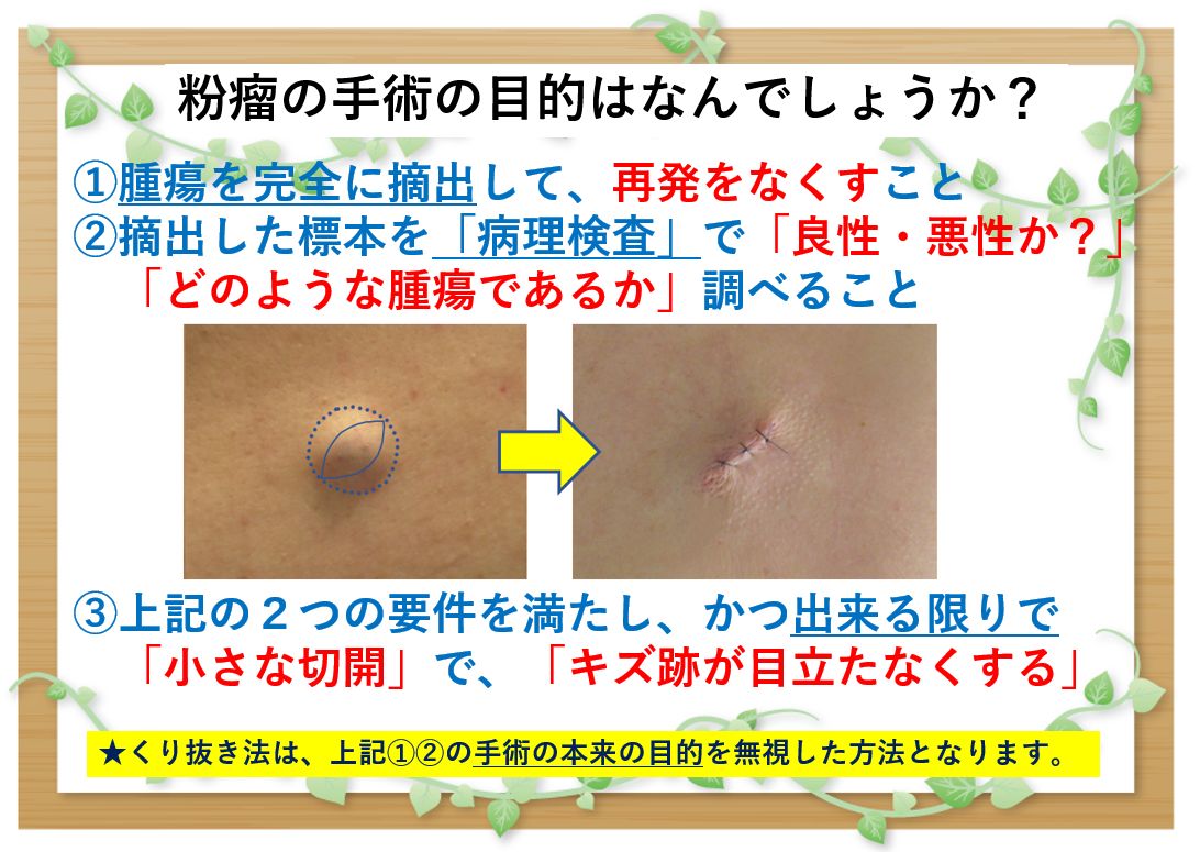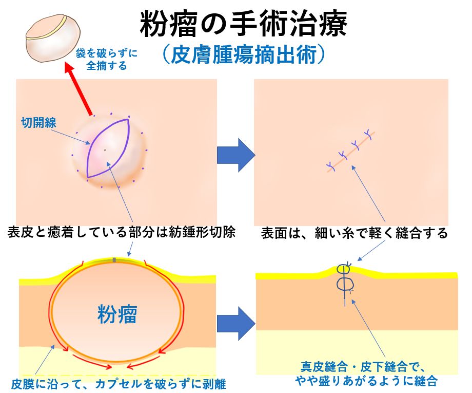 手術を行う主な目的は、「粉瘤を完全に切除し再発をなくすこと」+「取り出した腫瘍が万が一悪性でないことを病理検査で確認する」ことです。なおかつ、通常法である紡錘形切除を如何にきれいに仕上げるかが、皮膚外科の専門である形成外科の腕の見せ所となります。