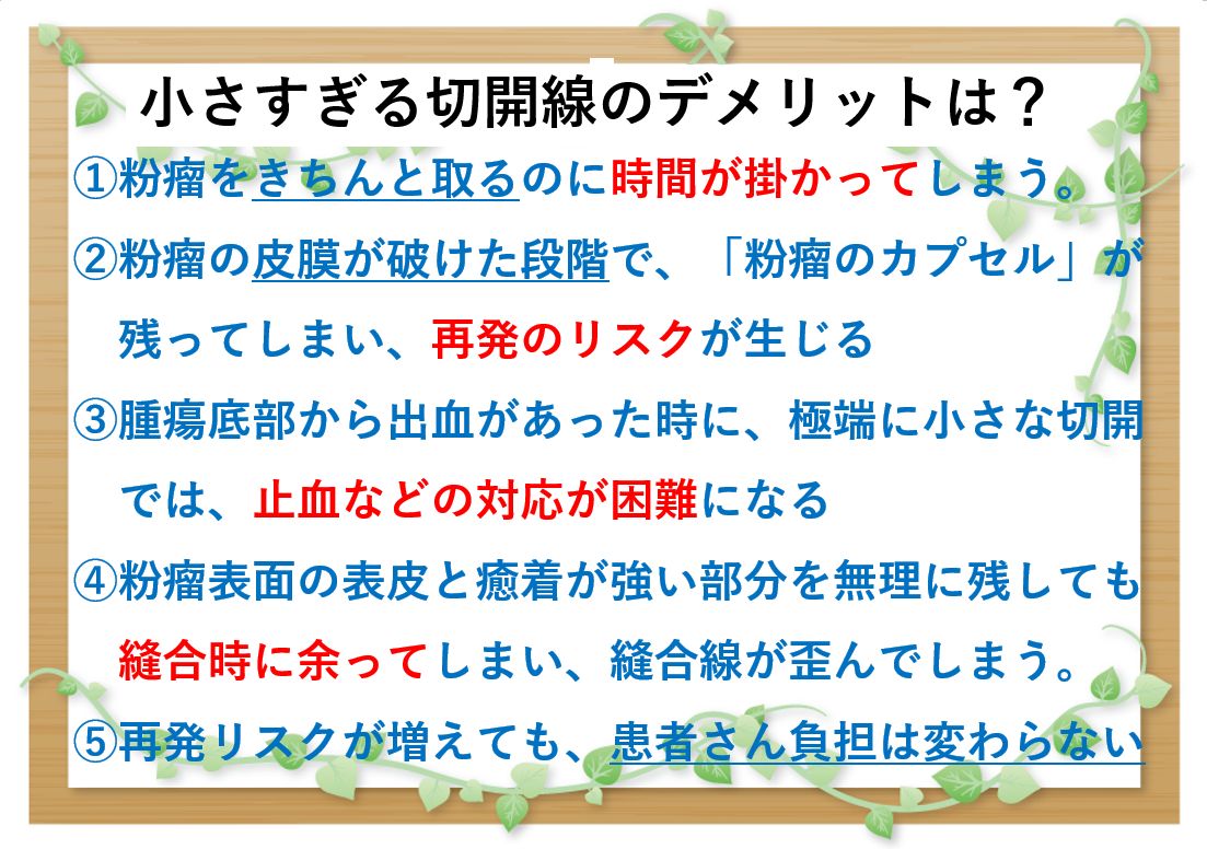 などの問題が発生するため、腫瘍+αのなるべく小さい切開線で摘出する方がバランスも良いようです。