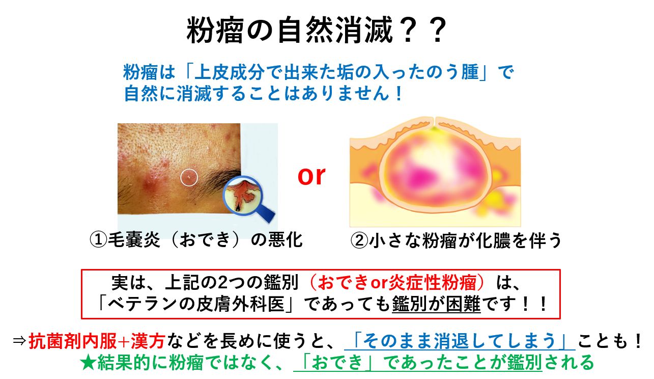 粉瘤は、皮膚の中に「上皮成分」で出来たカプセル(袋)ができる病気であり、自然になくなってしまうことはありません。一方で、「他の皮膚科で粉瘤ですよ」と診断されて、そのままお薬を飲んでいると自然に消滅してしまう場合があります。その場合には、粉瘤ではなく「毛嚢炎(おでき)」であったのかもしれません。