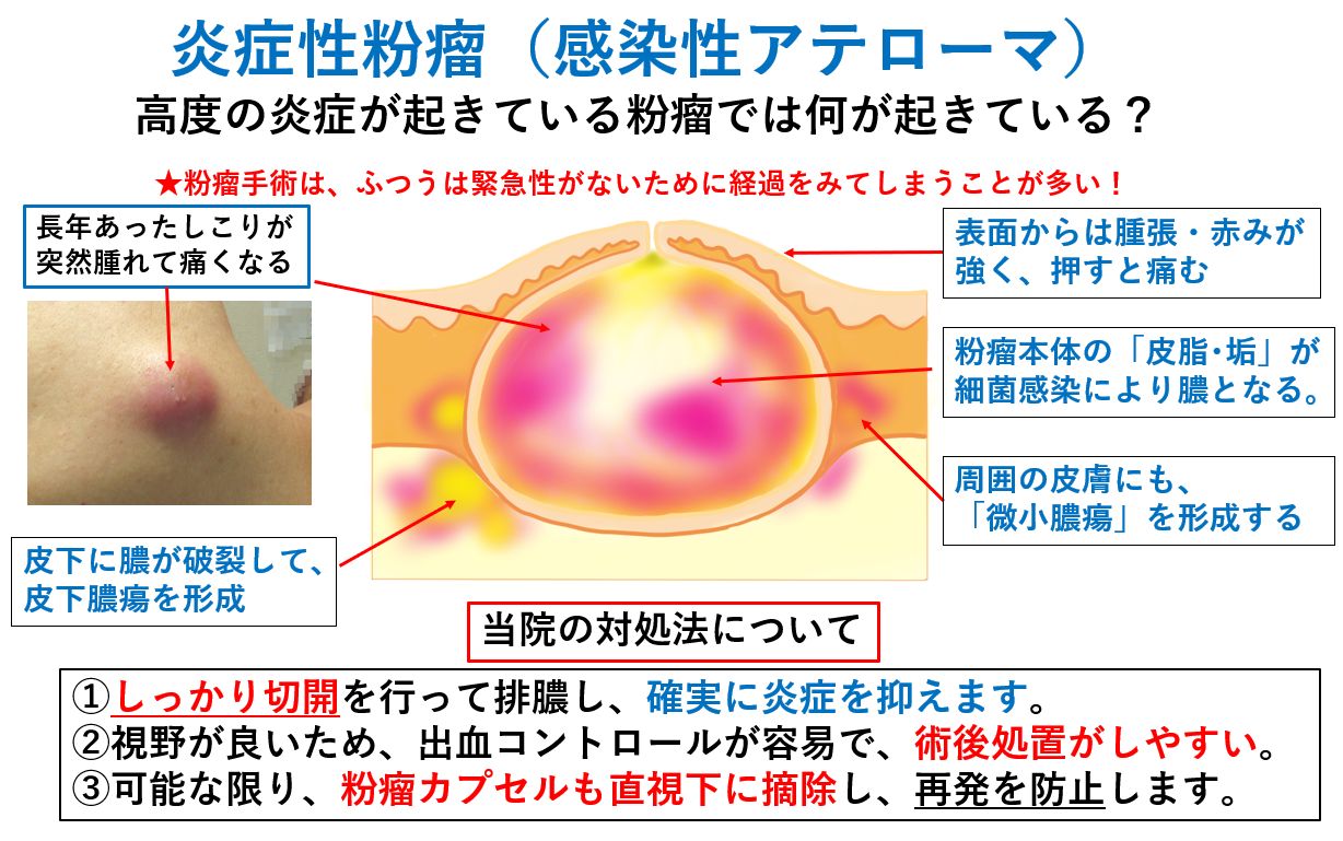 元来、良性の皮膚腫瘍であるために、「普通の皮膚科」を受診すると、治療をせずに放置してもよいといわれてしまうことがあります。たしかに、すぐに命に係わる疾患ではないため緊急性はないのですが、放っておくと徐々に大きさを増した結果、中の垢のかたまりに「感染を併発」してしまい、「炎症性粉瘤」となってしまうことがあります。