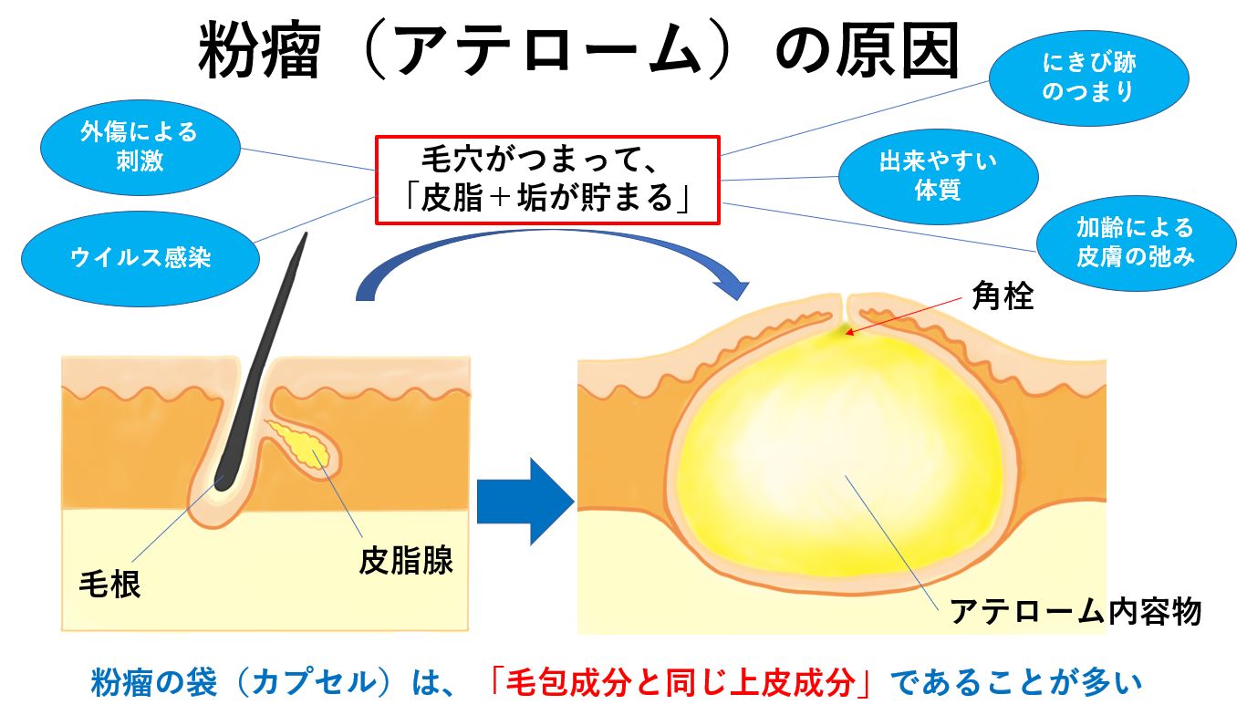 粉瘤の原因は、何らかのきっかけにより「毛穴の一部」が皮膚内の嚢腫をつくることです。 別名、毛包嚢腫(表皮のう腫)とも云われ、粉瘤の「袋=カプセル」の構成成分としては、「毛包~毛根部分」の上皮成分と同じ構造が見られるため、主として毛包起源で発生するものと考えられます。