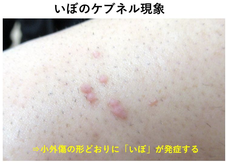 さらに、掻爬・小外傷にともなうケブネル現象で「線状に配列」することもあります。以前、受診された患者さんでは「サッカー」で転んでスパイクで傷がついた部分に一致して、線状にいぼができている方もいらっしゃいました。