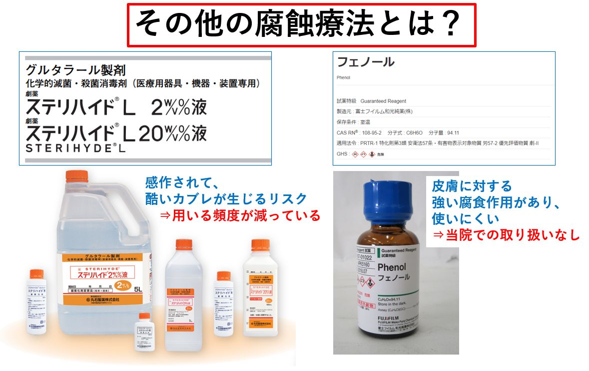 酢酸同様の「腐食作用・蛋白変性作用」がある強酸性の液体です。比較的古くから皮膚科医のあいだでは使われており、ガイドライン作成委員である江川清文先生も「有効性を実感している」と成書のなかで述べています。お子さんに対する「痛くない治療」として有名ですが、深い疣贅の患部に直接使う場合には、治療時に疼痛が強く出る場合があり事前の説明と注意が必要になります。