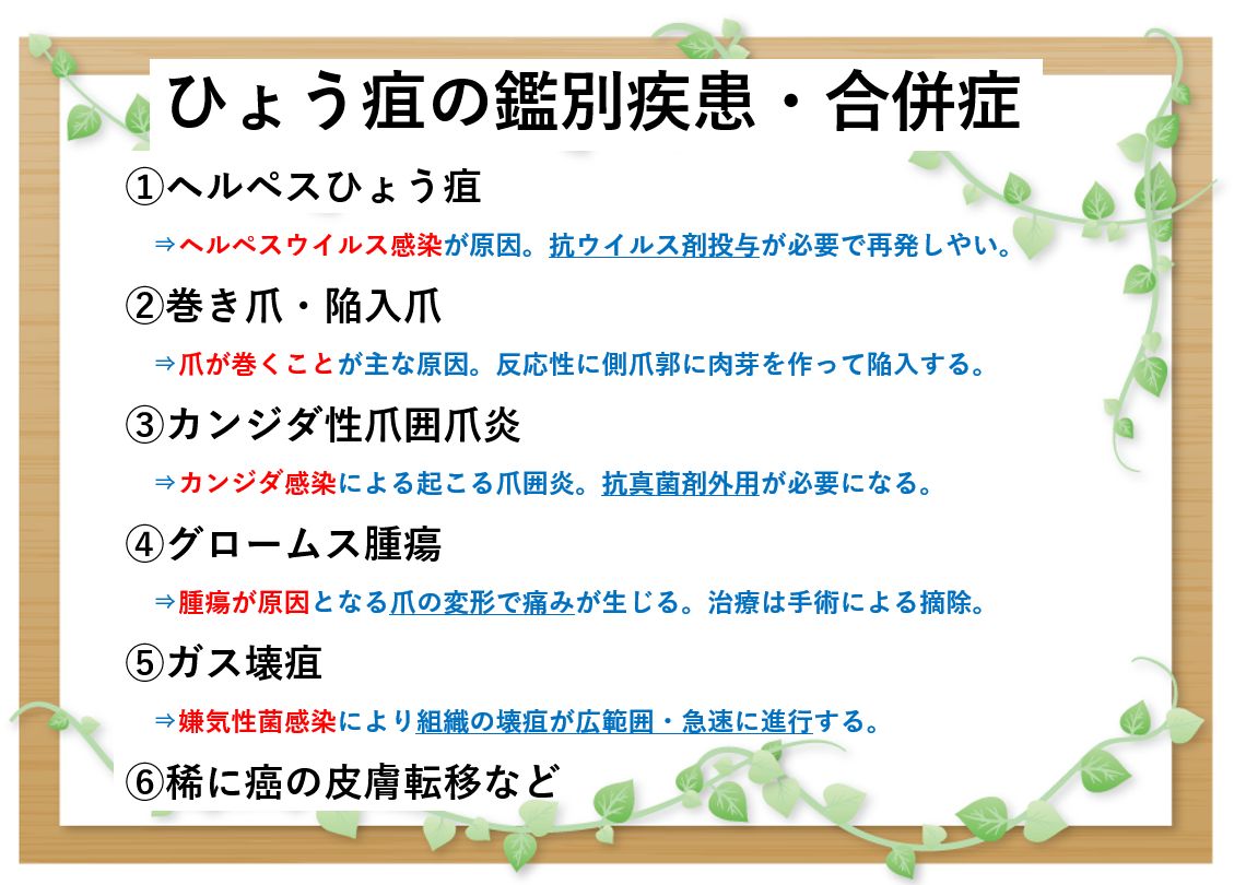 単純性ヘルペスの指先の感染によって生じます。「ひょう疽」と名前は付いていますが、細菌感染症ではない別疾患となります。ヘルペス感染は典型的な症状の場合は、「初期にむずがゆくなる・次第にピリピリとした違和感と腫れが生じる」、さらに「プツプツと集簇した水疱」が現れてくれば診断は容易です。皮疹が爪周りだけでなく、指背近位側にも広がることや症状経過を丁寧に問診することで判断します。通常の細菌感染であるひょう疽と違い、抗ウイルス剤内服が必要となります。