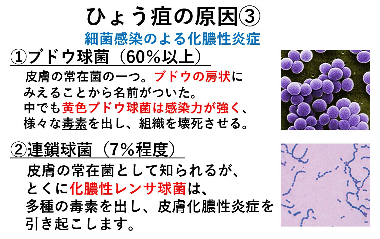 ひょう疽の起炎菌としては、ブドウ球菌60%以上)、連鎖球菌7%程度)が主となり、これら2種の混合感染もみられます。溶連菌、MRSA、嫌気性菌なども起炎菌となりえます。クリーム状の黄白色の排膿がみられた場合には、黄色ブドウ球菌感染のことが多くなります。黄色ブドウ球菌は皮膚の常在菌であるため、通常はひょう疽が他人に感染してうつることはありません。