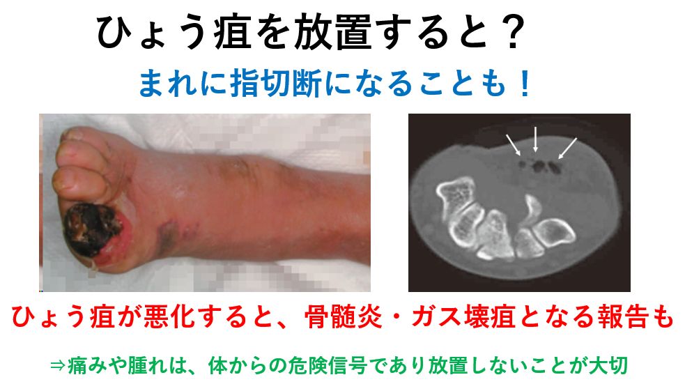 ひょう疽が遷延化した場合や、はじめから嫌気性菌感染を起こした場合には、ガス壊疽を起こした報告も稀にあります。感染は急速に進行して、手指・足趾が黒色壊死となってしまうこともあります。初期には通常のブドウ球菌感染との鑑別をおこなうことは困難なことも多いのですが、もしも経過が思わしくない場合には、総合病院の皮膚外科にただちに紹介とする必要も生じます。