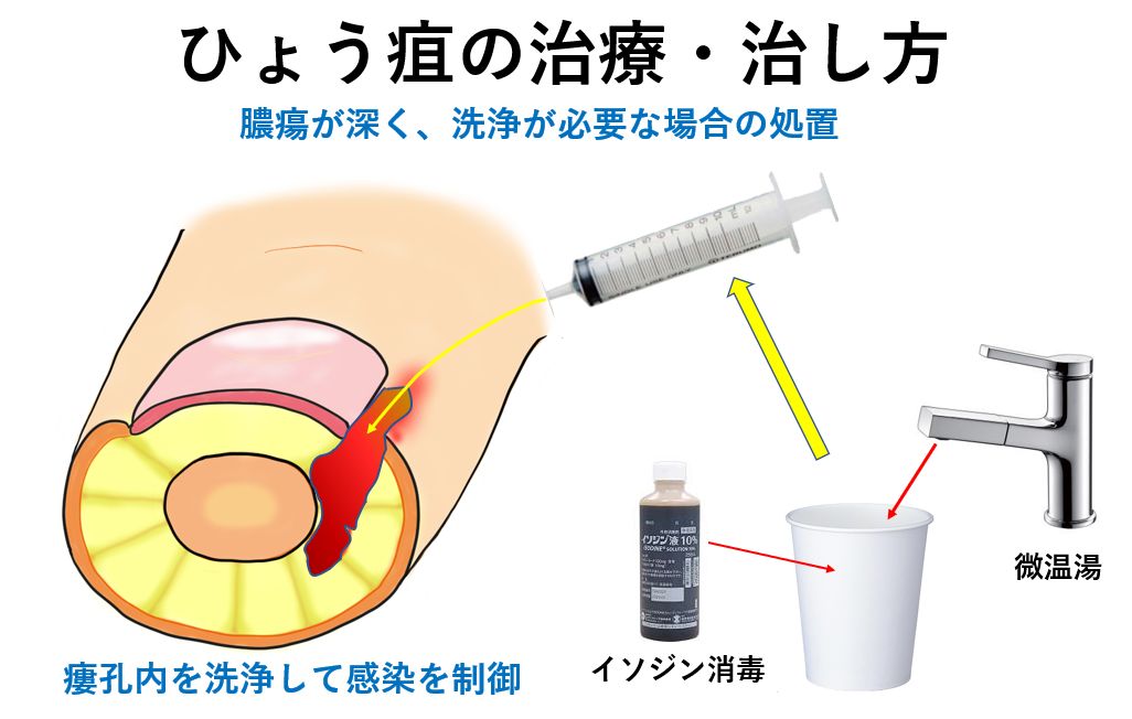 ひょう疽は、ごく初期であれば一般的に市販で売っている消毒剤、抗菌剤外用で症状が改善することもあります。一方、感染を起こした部位は通常の皮膚よりも、ばい菌感染に対する防御力が落ちてしまっていますので、何もせずに放置しておいて自然に治ることはありません。痛みや腫れという症状は、皮膚が感染を起こしているという「ご自身のからだ」から出ている危険信号です。軽くみて、そのまま放っておかないようにしましょう。