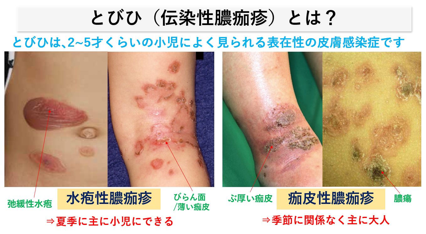 とびひとは、正式には「伝染性膿痂疹」と云い、2~5才くらいの小児によく見られる皮膚表在性の細菌感染疾患です。