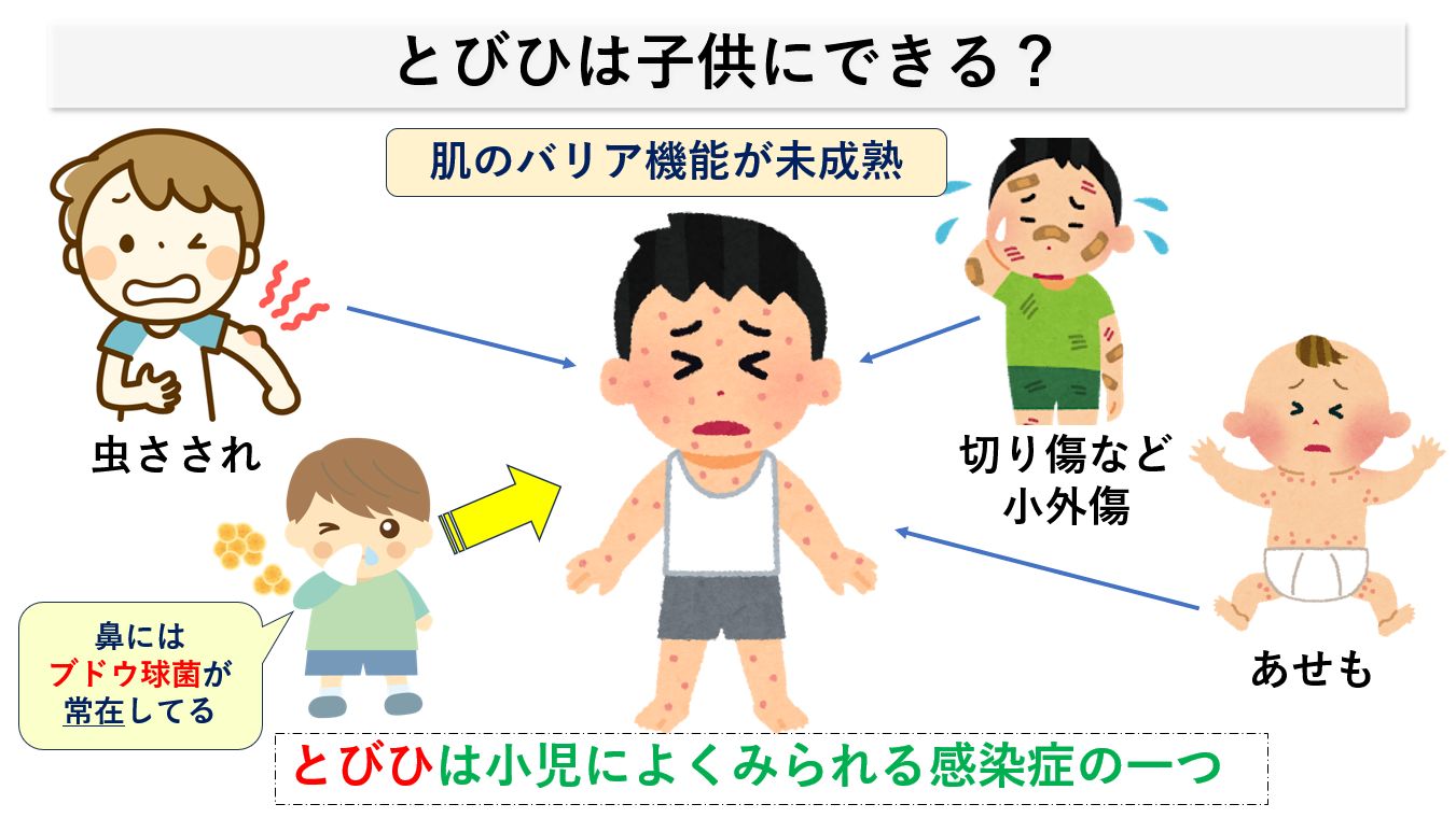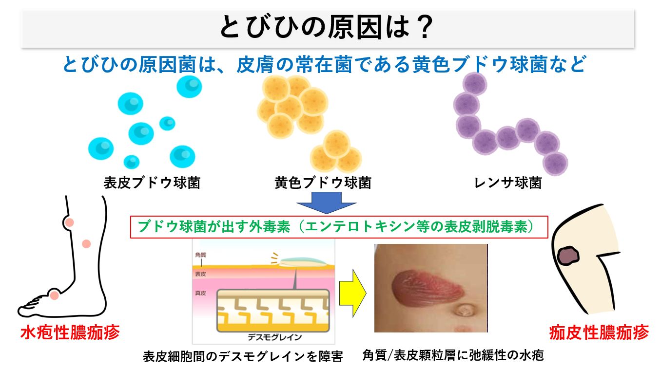 とびひの原因は、直接的にはなどを触ってしまった指先/爪先で外傷部分や湿疹のある部分をふれることによって生じるブドウ球菌などによる表在性の皮膚感染症です。