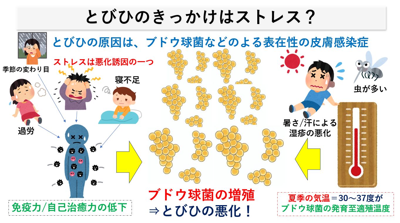 とくにストレス/睡眠不足などは、細菌感染疾患を悪化させる可能性がありますが、とびひが夏季に多いことから考えると、「暑さや汗による湿疹の掻き崩しや夏の気温」がとびひの悪化に係わっている可能性の方が大きいでしょう。ブドウ球菌は、常温での幅広い温度で増殖しますが、とくに30~37度で非常に活発に増殖至適増殖温度)することが最も大きな誘因と考えられます。