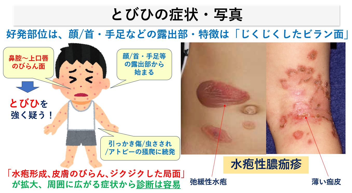 典型的なとびひは、引っかき傷/虫さされ/アトピーの掻爬に続く、「水疱形成、皮膚のびらん、ジクジクした局面」が拡大、周囲に飛び地の如く広がっていく等の臨床症状から診断は比較的容易です。