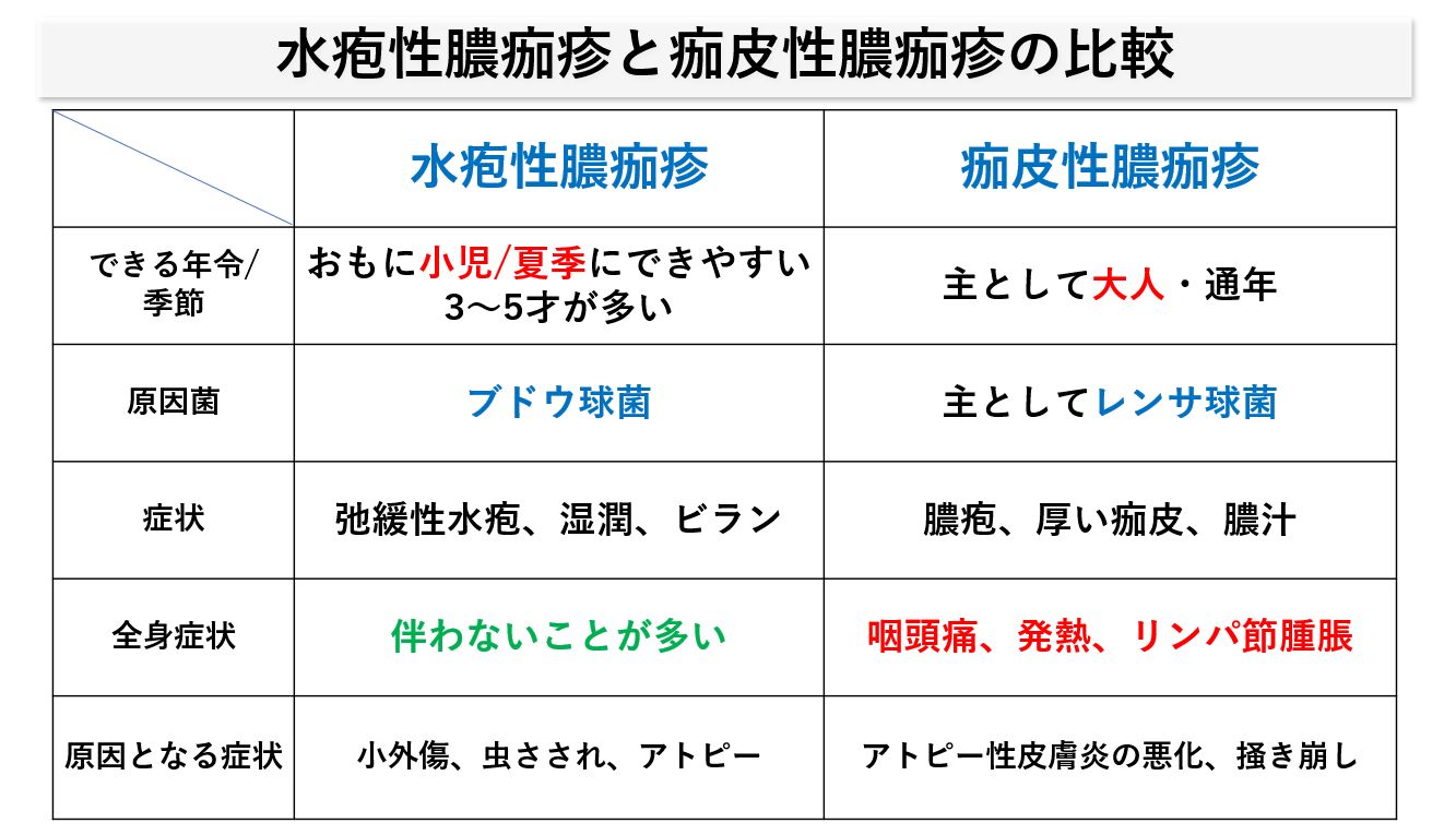 おおむね水疱形成があるものを「水疱性膿痂疹」と呼び小児に出来る「とびひ」のほとんどがこのタイプです。炎症が強く、厚いカサブタが付着するものを「痂皮性膿痂疹」と呼び大人にできることが多いのですが、湿疹を掻き崩したお子さんにも出来る場合があります。