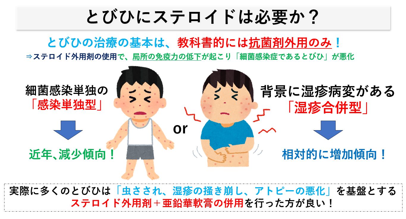 とびひの診断を行えずに、「単にステロイド外用剤」のみを使ってしまうと返って局所の免疫力の低下を引き起こし、「細菌感染症であるとびひ」が悪化することが危惧されます。原則論として、とびひは細菌感染症であり、ステロイドは禁忌で使ってはいけないことになります。