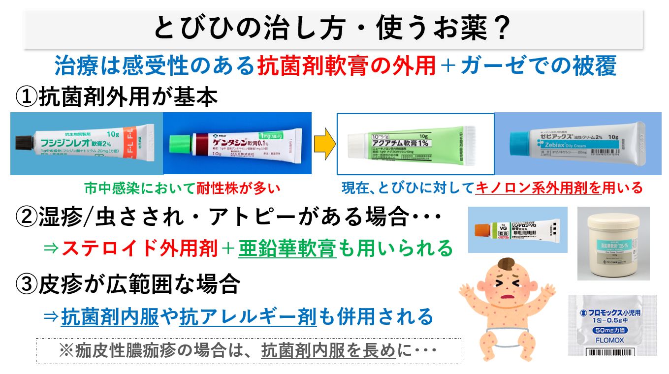 現在、市中でみられる「とびひ」では、キノロン系のアクアチム軟膏やゼビアックス軟膏が用いられます。外用剤治療は、いったん皮膚が乾いて治ってきたと思われても、少し長めに保護を続けないと、とびひが再燃してしまうこともあり注意が必要です。