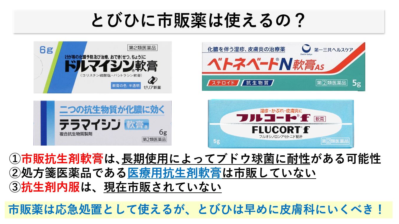 とびひに間違って、ステロイド外用剤のみを使ってしまうと返って悪化してしまう場合もあります。市販の抗生剤軟膏は一般大衆薬として長く使われているものが多いため、原因菌であるブドウ球菌に耐性がついてしまっており効かない可能性が高くなります。