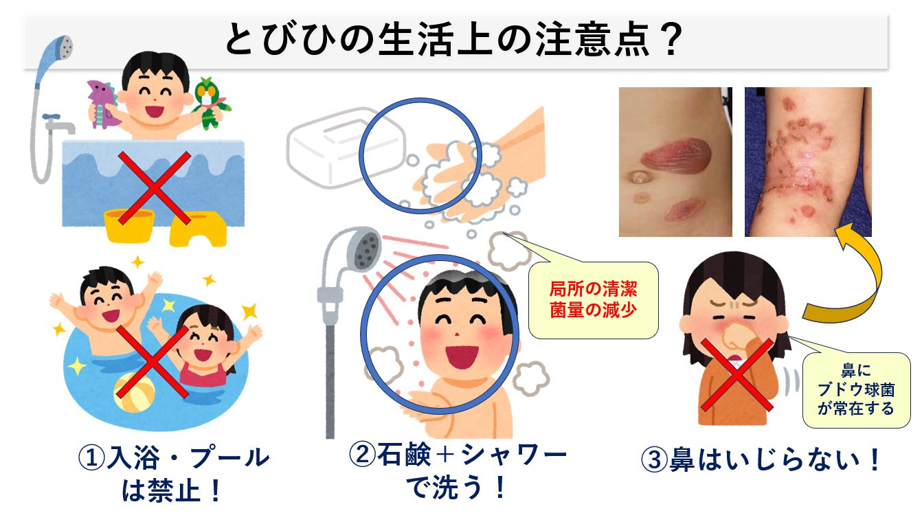 入浴・プールは禁止として、局所の清潔および菌量の減少を図るために「石鹸での洗浄+シャワーで流す」ことが大切です。タオルは患者さん専用として、共用を避けることで感染拡大を防ぎます。爪は切って患部を掻爬しないようにします。鼻孔には多数の常在菌がいるので、鼻をいじらないようにしましょう。兄弟がいる場合には感染児の入浴は最後におこないます。