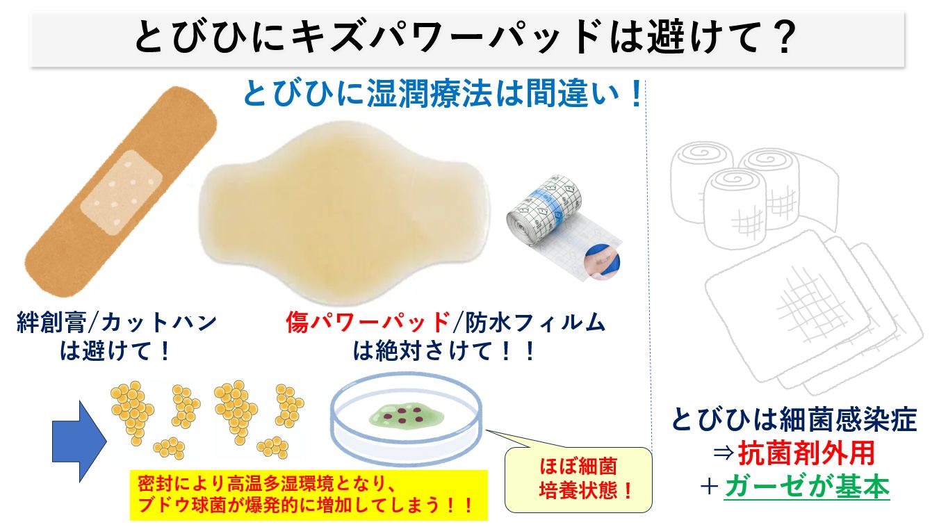 とびひが悪化してご来院される場合として、自己判断で「絆創膏/カットバン、キズパワーパッド、防水フィルム」などで覆ってしまっている方がいます。とびひの基本は、細菌感染症(+湿疹・アトピーの悪化)ですので、とくにキズパワーパッドで密封してしまうと「爆発的にブドウ球菌が増えて」、皮膚がドロドロになってしまっているケースもあります。
