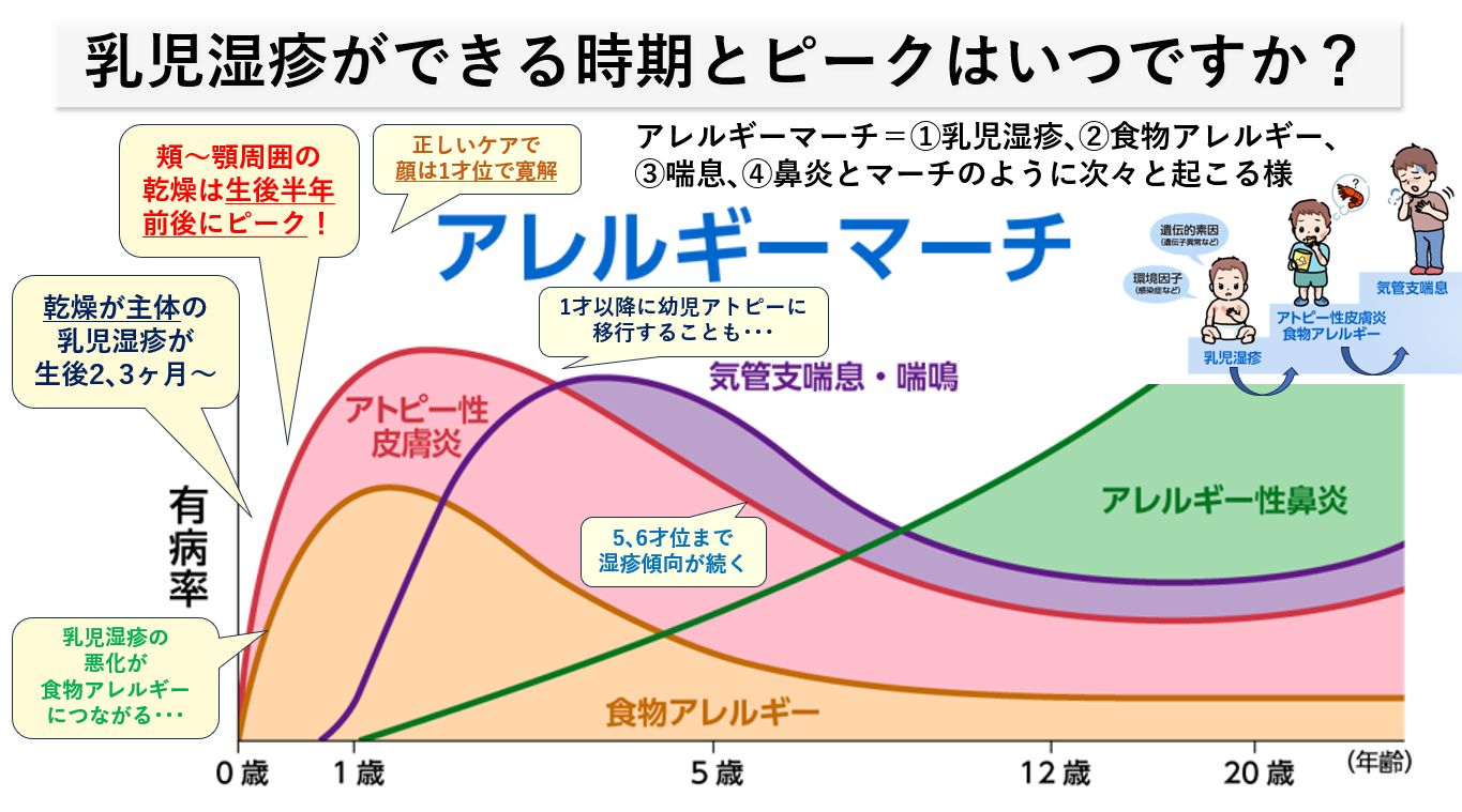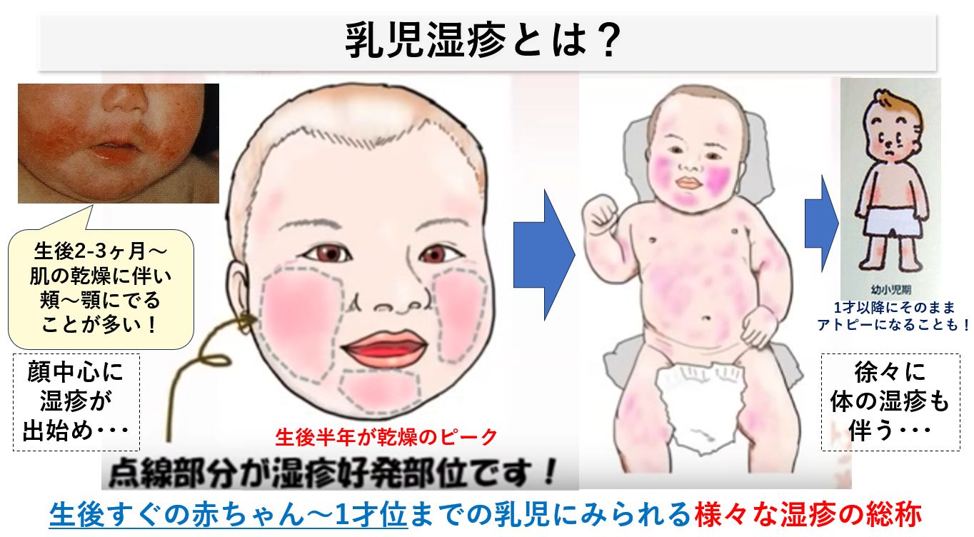 - 乳児湿疹の半数では1才を過ぎてから「幼児期のアトピー性皮膚炎」に移行するとされ、生後12カ月までに出来るだけ肌を良い状態にしていくことが大切です。