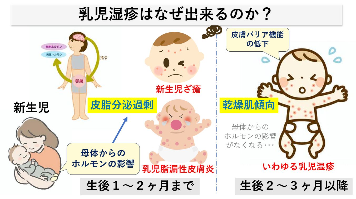 生後間もない新生児では、母体からのホルモンの影響で皮脂分泌が盛んな時期が生後1~2カ月あり、「新生児ざ瘡(にきび)、乳児脂漏性皮膚炎」など皮脂腺の活動が過剰となって生じる皮膚疾患となって現れます。一方で、生後2~3カ月以降に生じる「いわゆる乳児湿疹」は、母体からのホルモンの影響がなくなることにより、「皮脂分泌過剰状態」から「急速に乾燥肌傾向」となることによって肌のバリア機能が弱まり様々な湿疹が生じてしまうのです。