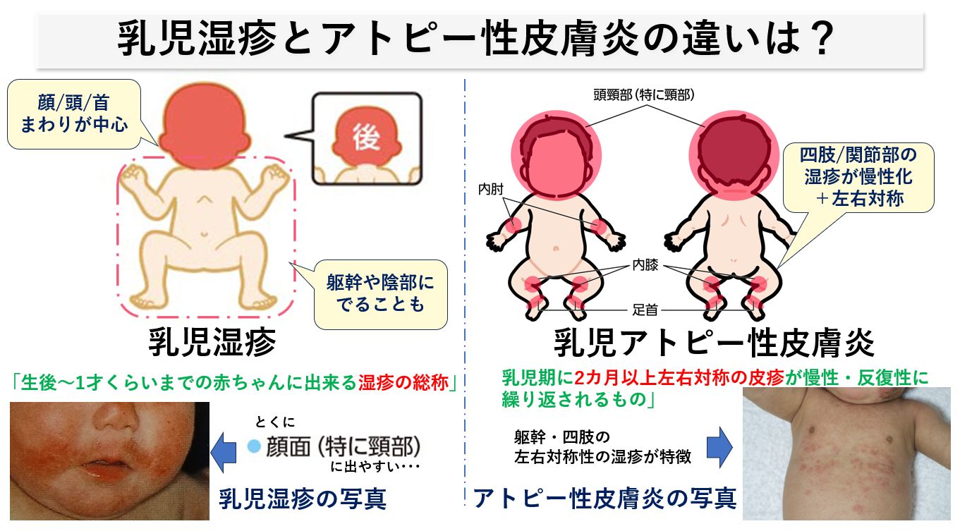 乳児湿疹とアトピー性皮膚炎の明確な区別はありません。乳児湿疹は「生後~1才くらいまでの赤ちゃんに出来る湿疹の総称」であり、アトピー性皮膚炎の診断基準では、「乳児期においては2カ月以上左右対称の皮疹が慢性・反復性に繰り返されるもの」を乳児におけるアトピー性皮膚炎と定義します。