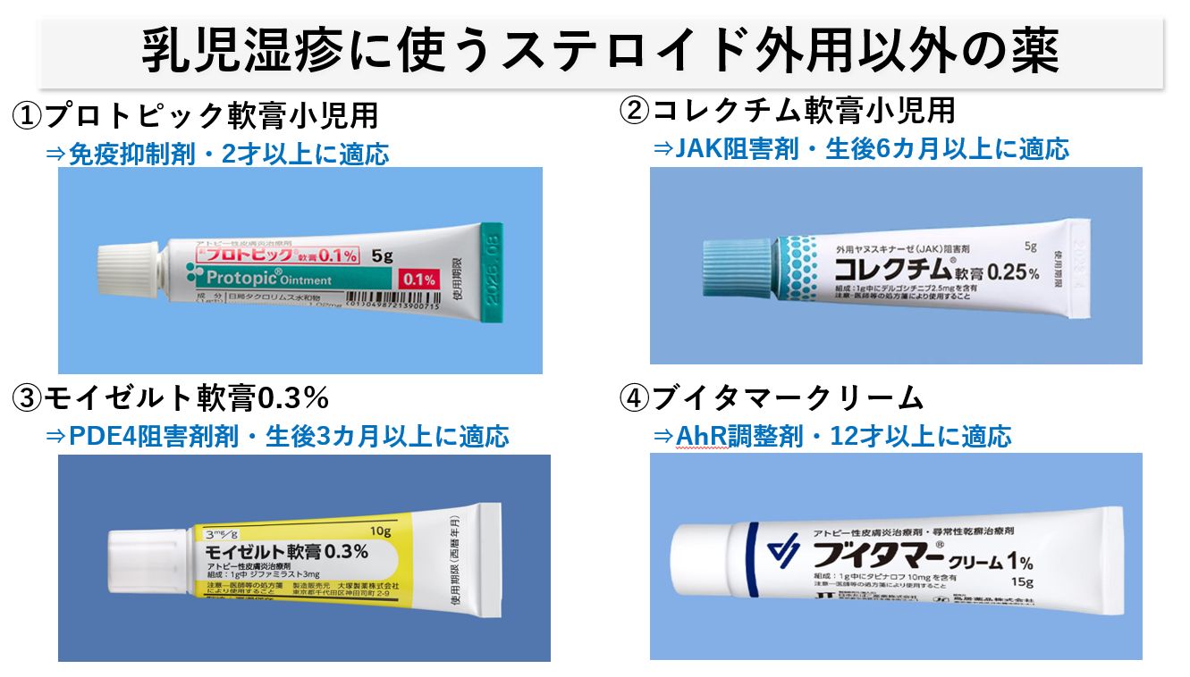 以上、どの外用剤もステロイド外用剤のような速効性はなく、現在もステロイド外用剤による皮疹のコントロールが乳児湿疹の基本であることはかわりません。