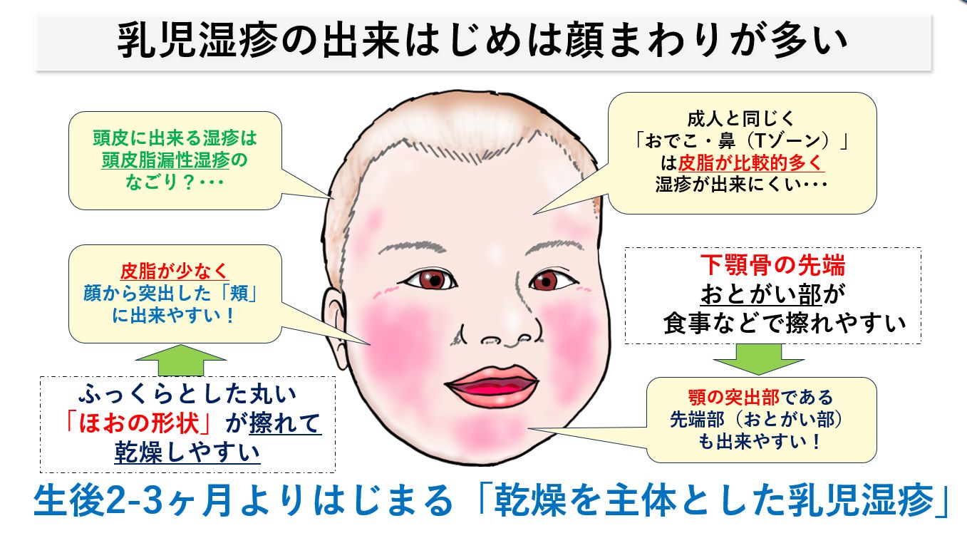 生後2-3ヶ月よりはじまる「乾燥を主体とした乳児湿疹」では、皮脂が少なく顔から突出した「頬まわり」や顎の突出部である先端部(おとがい部)に湿疹が出やすくなります。赤ちゃんでも成人と同じく「おでこ・鼻(Tゾーン)」は皮脂が比較的多く湿疹が出来にくいのですが、生後2-3ヶ月のふっくらとした丸い「ほほ」の形状が擦れやすく、乾燥しやすいのです。