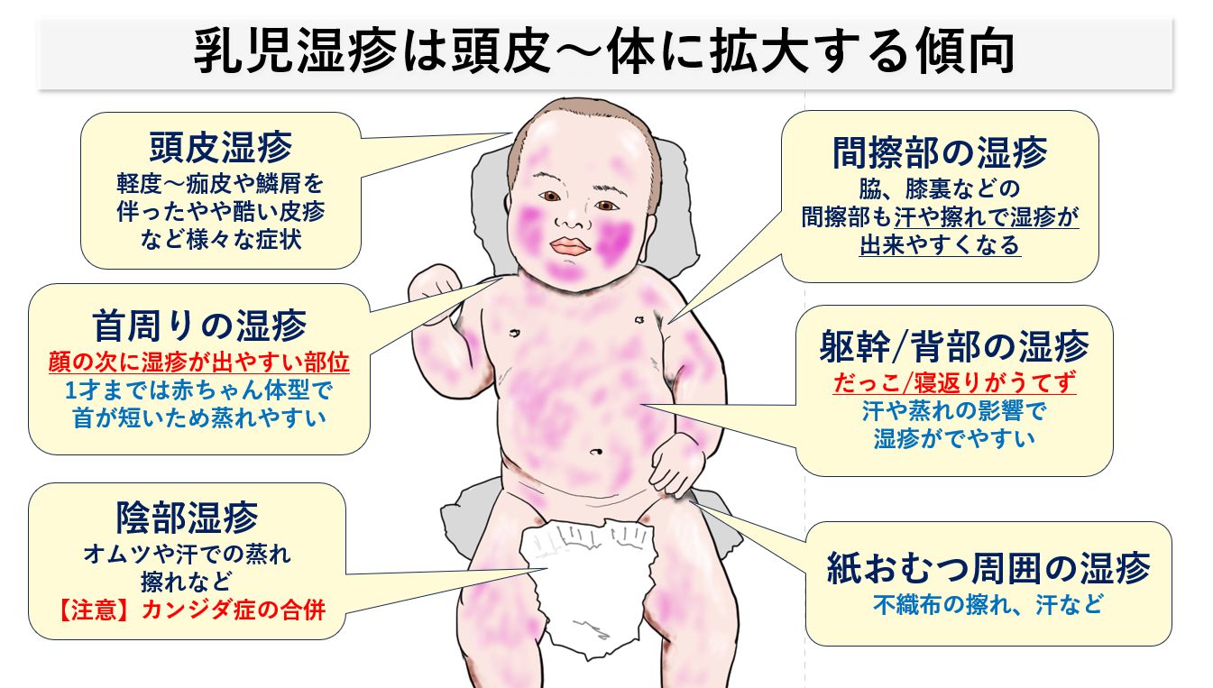 赤ちゃんは成長に従って、出やすい湿疹も変わってきます。まだ寝返りがうてない時期には、汗で背中に湿疹がでてしまうこともあります。また、陰部では間擦疹という湿疹もでるのですが、皮膚カンジダ症も合併することもあり、それぞれの時期/状態に応じたケアの指導を行っていく必要があります。
