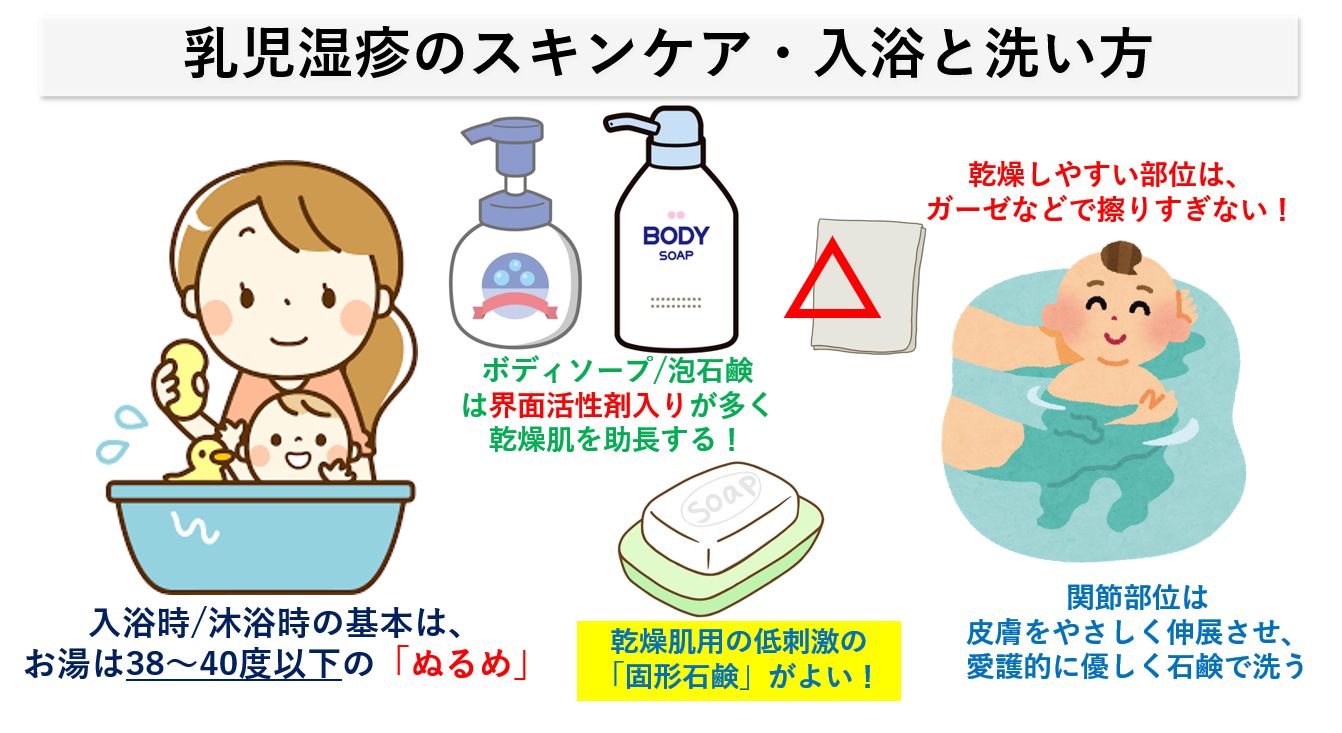 つい手軽に使ってしまうボディソープ/泡石鹸には、「界面活性剤が入っている」ので、使用を避けましょう。乾燥肌用の「低刺激の固形石鹸」を軽く泡立ててやさしく撫でるようにあらい、皮脂は落としすぎないようにします。湿疹が悪化した部分は、少量の石鹸洗いに留めるか、「お湯のみで軽く流す」程度にしてみても良いでしょう。