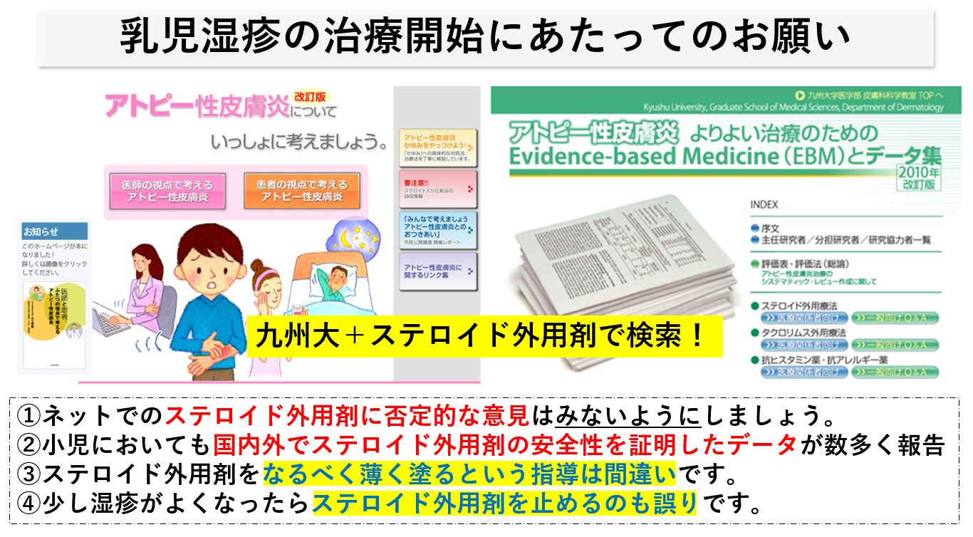 - 小児においても国内外でステロイド外用剤継続の安全性を証明したデータが多く報告されています。とくに九州大学皮膚科ではアトピー性皮膚炎に対するステロイド外用剤の情報を発信していますので、ご参考にされてください。(※九州大+ステロイドで検索)