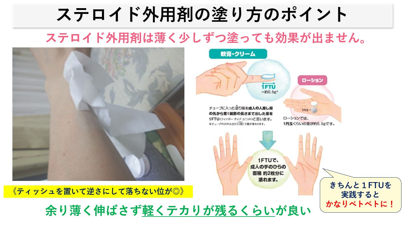 ステロイド外用剤は薄く少しずつ塗っても効果が出ません。塗布する場合は余り薄く伸ばさず軽くテカりが残るくらいが良いでしょう。スキンケア(洗い方や服)・保湿剤を継続してしっかり使うことももちろん大切です!