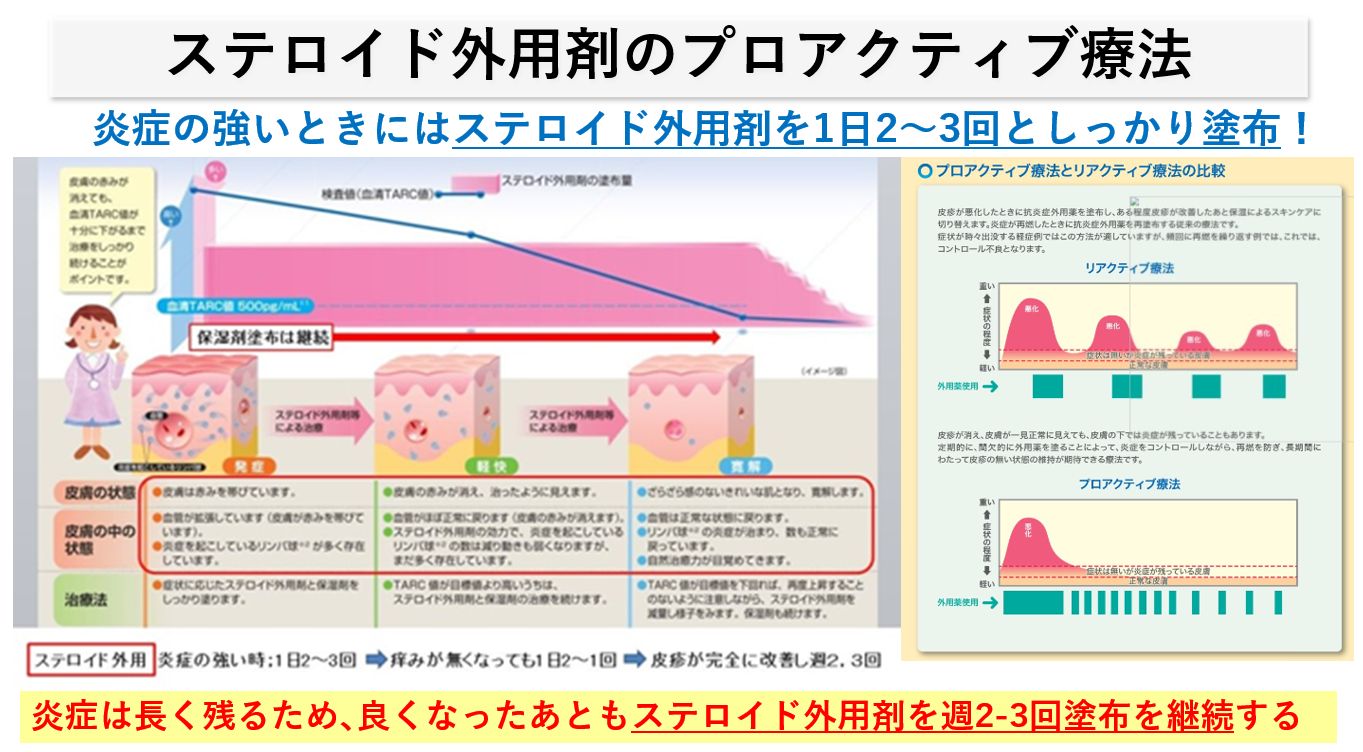 - この時点でステロイド外用剤を止めてしまうとすぐに炎症が再燃します(リアクティブ療法)。肌がザラつくときは、1日2回~1-2回と塗布を続けることが大切となります。かなり状態が良くなればステロイド外用剤は1日1回程度とし、皮疹がほぼ見られなくなってから、さらに塗る頻度を2日に1回と落としていきます。症状が完全に消えて「つるつるの正常な皮膚」になってからも週2-3回と塗布を予防的に続けることを《プロアクティブ療法》と云います。