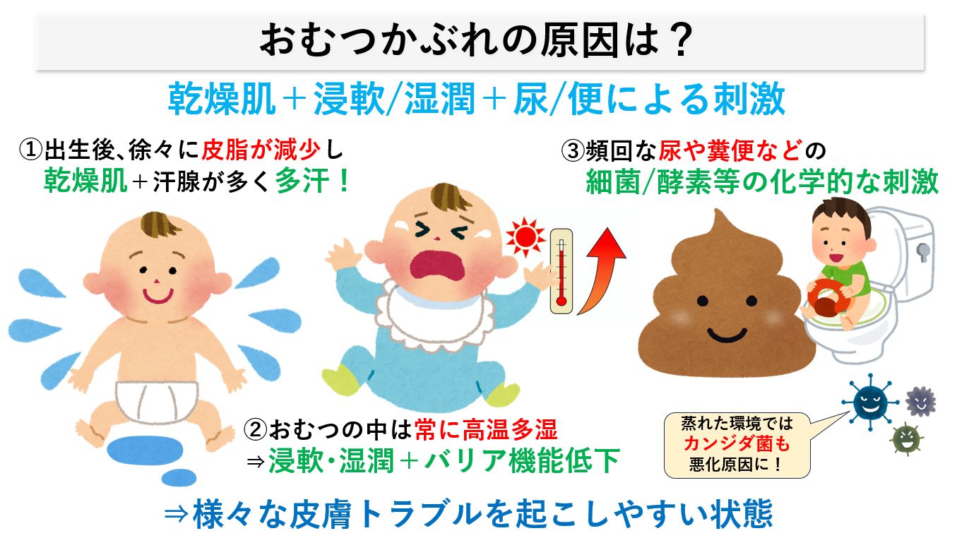 2. 近年のオムツは高吸収性ポリマーなどの素材/機能ともに進化し、不織布の工夫/通気性は改善しているものの、「おむつの中は常に高温多湿」な環境です。皮膚が浸軟・湿潤し、さらにバリア機能が低下し、刺激に過敏な状態となってしまいます。おむつ交換の頻度が低く、じめじめした湿潤環境や汗をかきやすい状態が長く続くと、更におむつかぶれが出来やすくなります。
