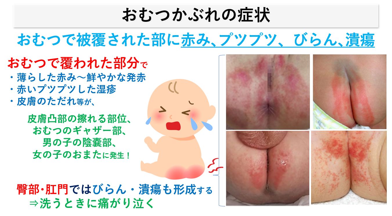 おむつで被覆された部分に、淡紅色~鮮紅色の紅斑、丘疹が生じて、臀部や肛門周囲には悪化するとびらん・潰瘍も併発します。最近のおむつは性能が改善されてきており、オムツ自体にかぶれてしまい皮膚炎起こすことは少ないとされますが、皮膚とオムツの接触・摩擦によって皮膚の凸となった部分が擦れによって悪化しやすい傾向があります。