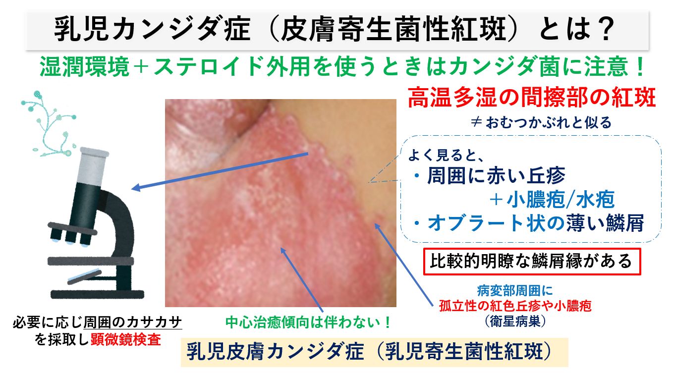 乳児寄生菌性紅斑とは、皮膚常在菌であるカンジダ菌(Candida albicans)が、免疫力の弱い赤ちゃんなどの陰股部・臀部・首周りなどにとくに夏などで汗をかいて高温多湿の環境ができてしまうと発生する皮膚カンジダ症の一つです。通常のおむつ皮膚炎との見分け方は、高温多湿の間擦部にできる紅斑であることに加え、周囲に紅色丘疹・小膿疱/水疱とオブラート状の薄い鱗屑を伴うことが特徴です。正常皮膚とのあいだに比較的明瞭な鱗屑縁があることからも見分けがつきます。