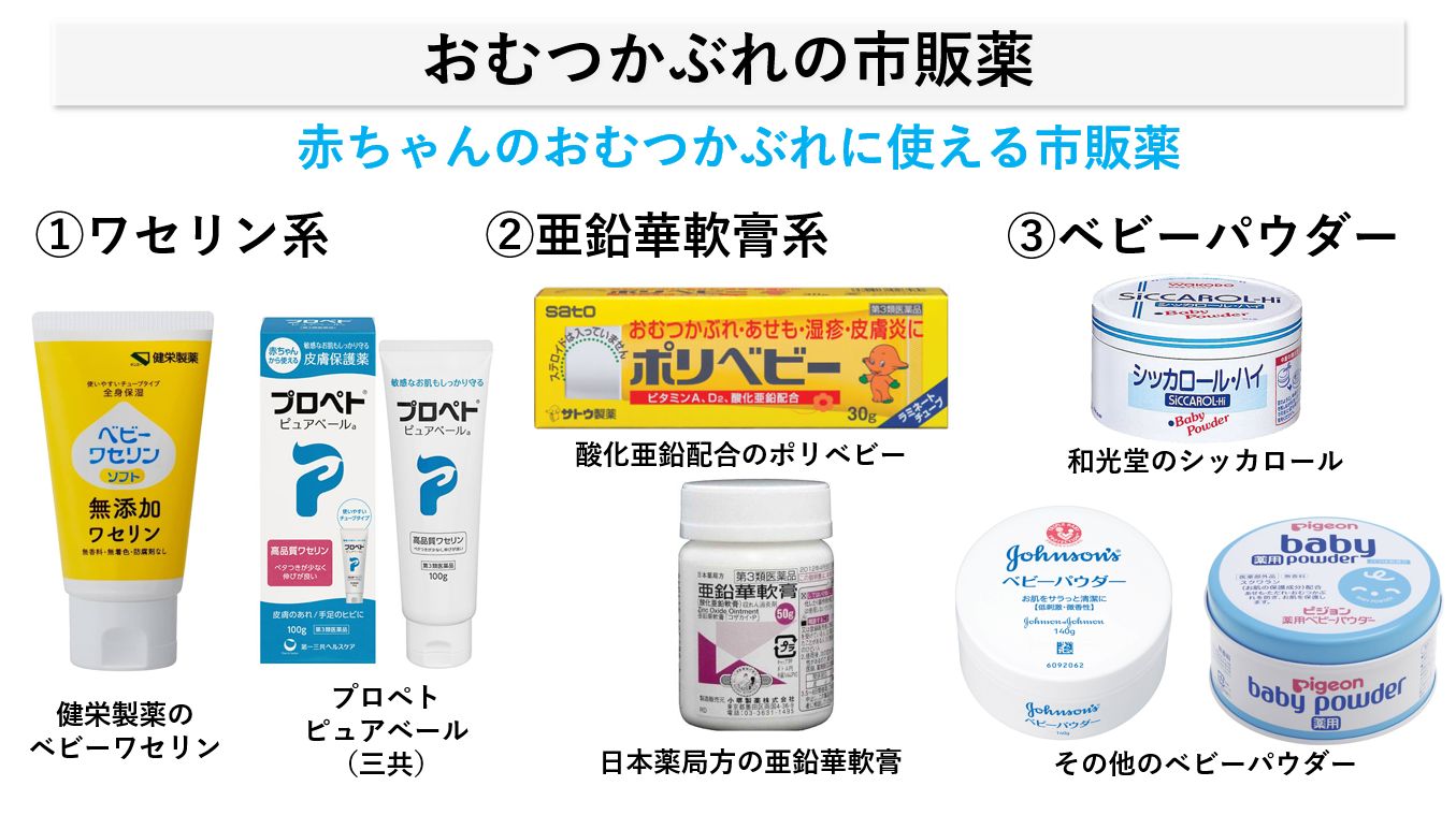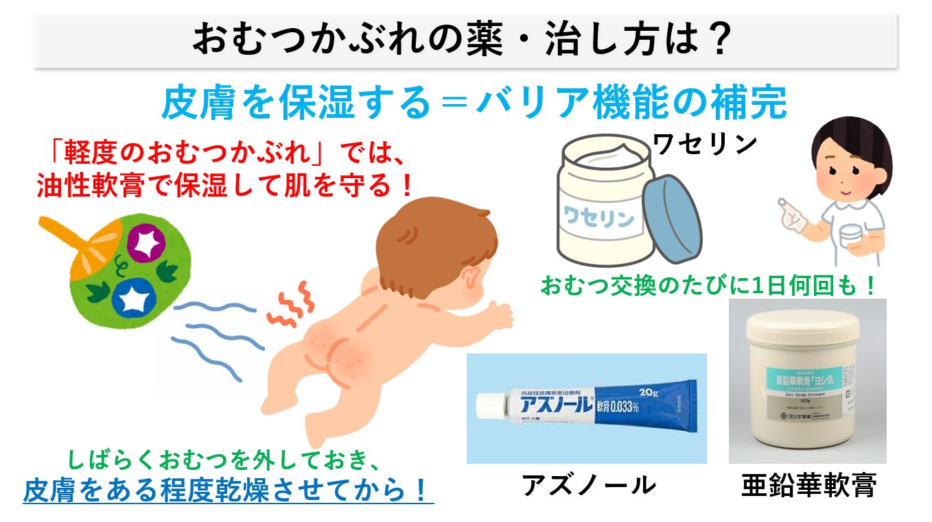 また、皮膚カンジダ症に効果のあるケトコナゾール配合の市販薬は発売されていないので、「ワセリン・亜鉛華軟膏系」で保湿をしっかり行っても治りにくい「おむつかぶれ」は早めに皮膚科を受診しましょう。また小児科を受診した場合にもステロイド外用剤の使用は短期にとどめ、治りが悪いときには小児を得意としている皮膚科を受診した方が良いでしょう。