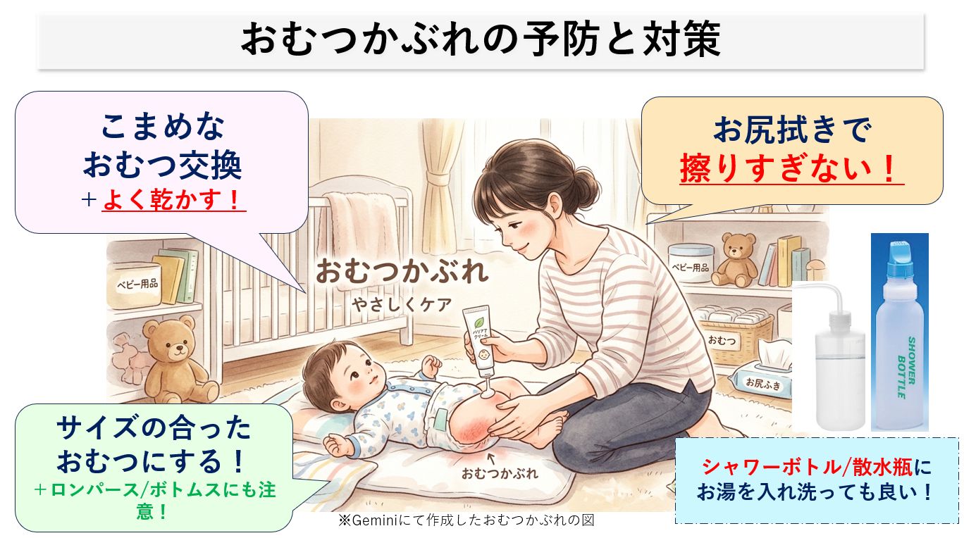 おむつの中の蒸れた湿潤状態・糞尿などで汚染した状態をなるべく短くすることが、まず大切です。おしっこやウンチをしたときには、なるべく早く新しいおむつに交換してあげることが、おむつかぶれの予防として最重要です。皮膚がつねに湿った状態であることは、おむつかぶれ(オムツ皮膚炎)を生じやすくするだけでなくカンジダ菌の増殖も促進してしまうのです。